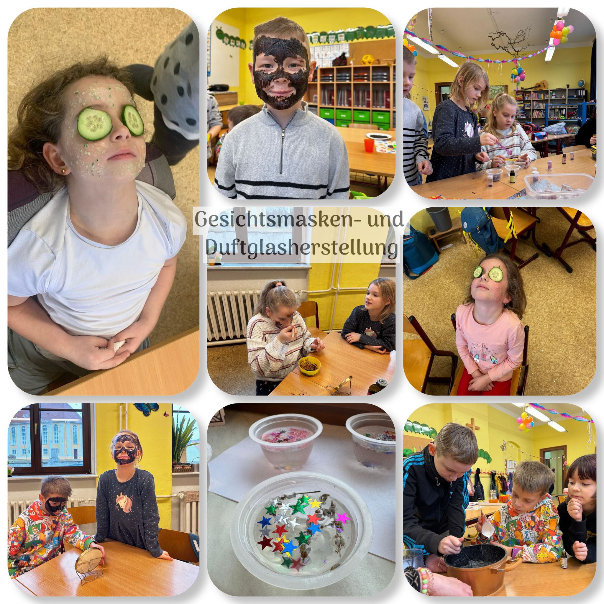 In der ersten Woche hieß es an zwei Tagen: Entspannung pur. Am Dienstag gab es eine Yogastunde mit Übungen, Entspannungsgeschichten und ruhiger Musik. Am Freitag stellten wir Duftgläser und Gesichtsmasken her. Beide Tage kamen bei den Kindern sehr gut an.