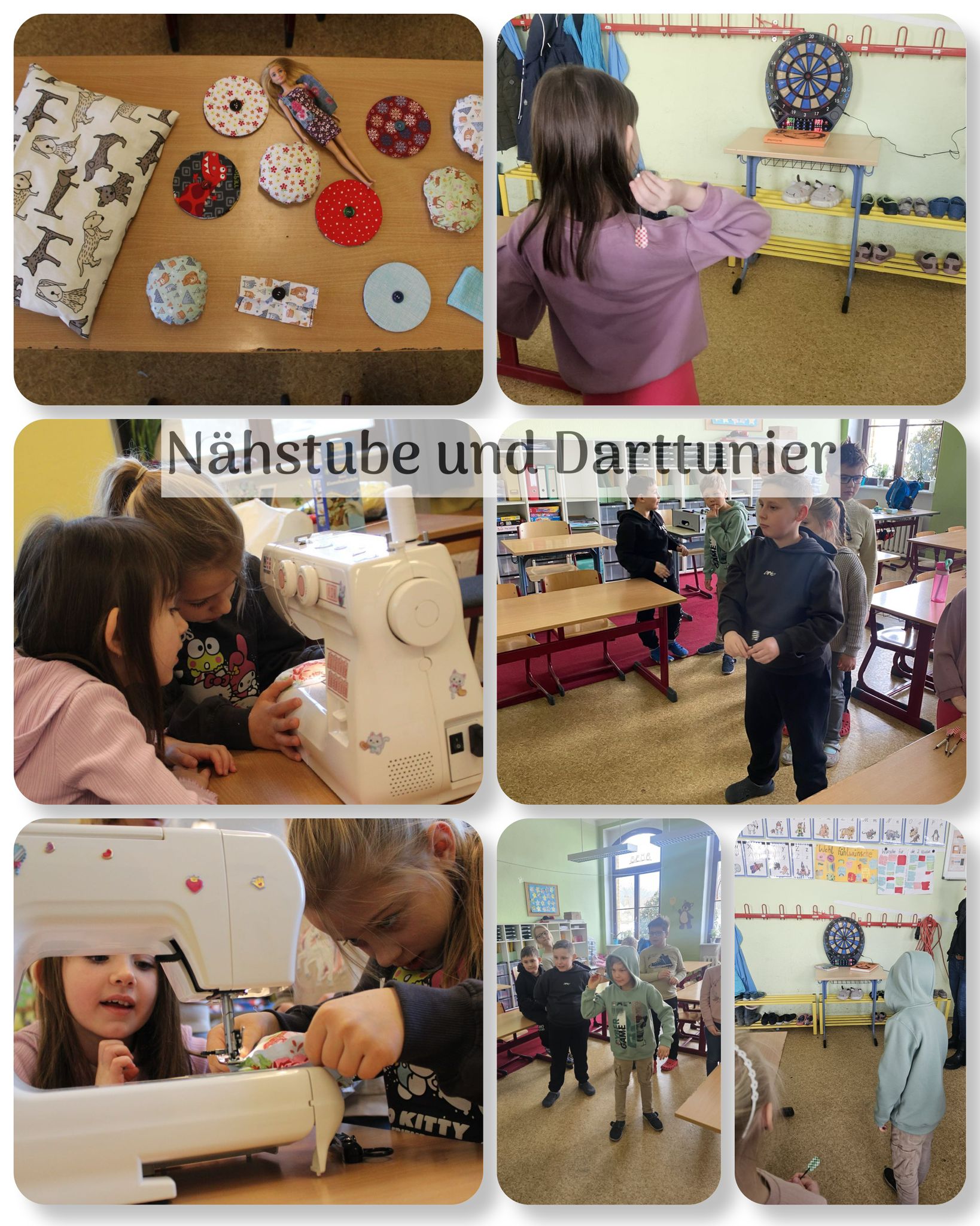 Zum Abschluss der Ferien wurde der Hort zur Nähstube. Mit Nadel, Faden und Stoffen entstanden individuelle Projekte. Dabei wurden viele Kartenhalter, Kissen und sogar ein Kleid für eine Barbie genäht.