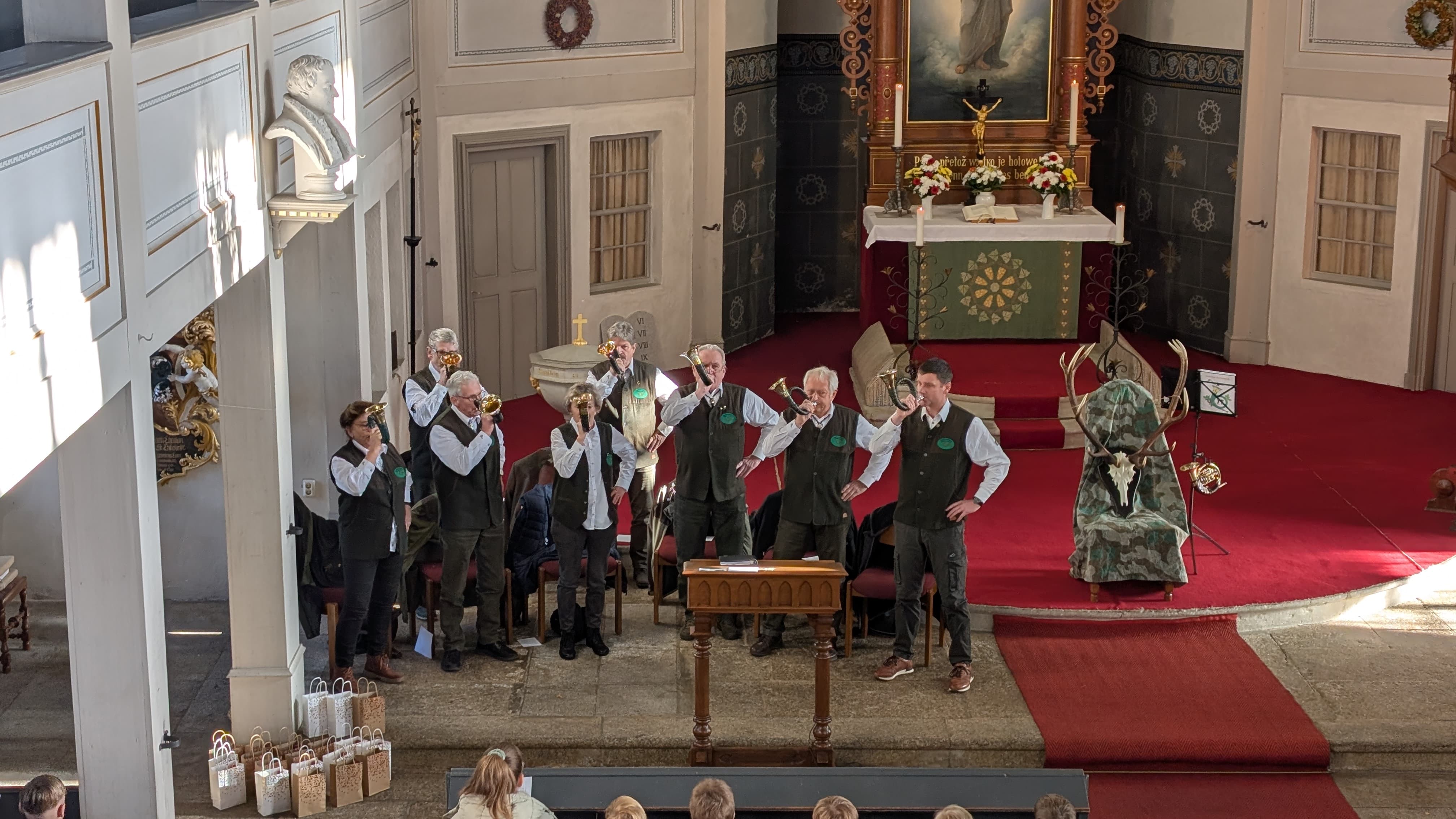 Wie in jedem Jahr gestalteten die Jagdhornbläser vom Elsterwald und die Geierswalder Bläsergruppe mit den Parforcehörnern diesen besonderen Gottesdienst.
