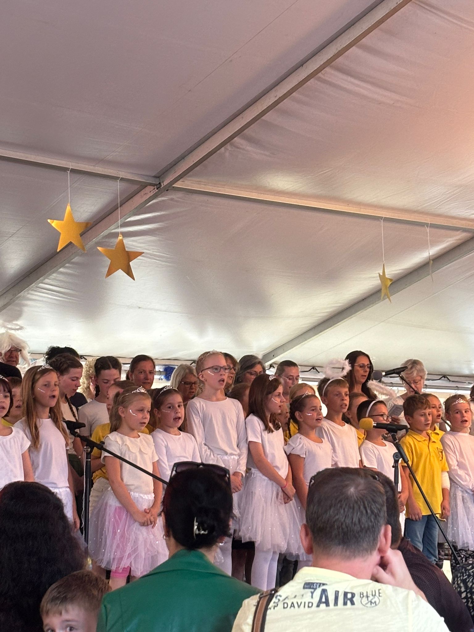 Am Samstag war es dann schwierig, in Oßling noch einen Parkplatz zu finden. Bei schönstem Spätsommerwetter startete pünktlich um 15 Uhr das große Programm im Zelt. Frau Osang hatte wieder tolle Ideen und diese wurden von den Lehrern und Schülern der Grundschule super umgesetzt. Es war eine Freude den Schauspielern und Sängern zu lauschen. Ein Novum war der Schüler-Lehrer-Chor, in dem auch der Musikkurs der Klasse 10, unter Leitung von Frau Seiler, mitsang. Ich fand uns großartig und ganz sicher werden wir zum Weihnachtssingen daran anknüpfen. Vielleicht können wir dann auch wieder unseren Schulleiter im Engelskostüm bewundern?
