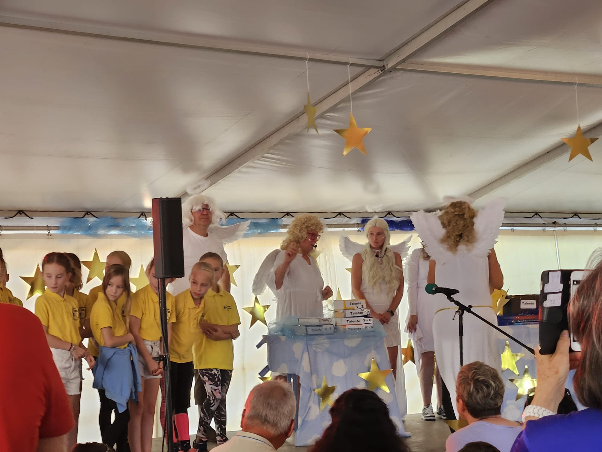 Am Samstag traf man sich im Zelt unter den Kastanienbäumen zur Schuleinführung der Klasse 1. Diakon Vogel stimmte alle mit einer kurzen Andacht auf das Lernen an der Christlichen Grundschule ein und die Schulleiterin, Frau Neumann, fand liebevolle Worte zum Schulbeginn. Ein liebevoll gestaltetes Programm der Grundschüler unter der Leitung von Frau Seiler rundete den Schuleingang ab.
