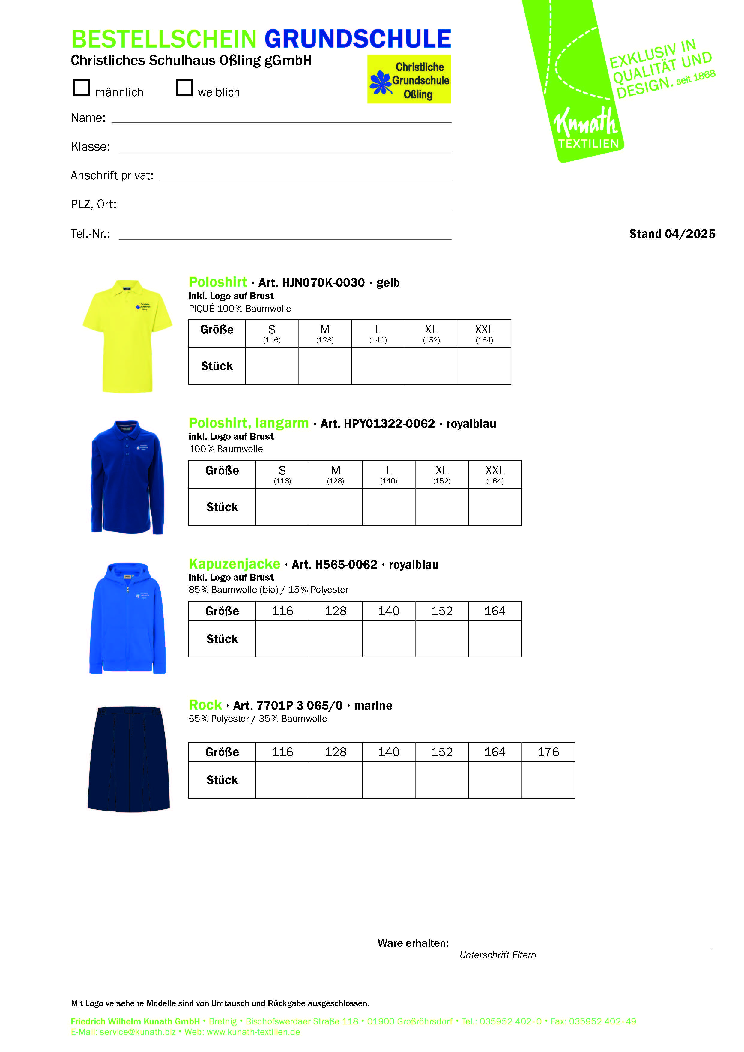 unsere Schüler tragen Schulkleidung. Bitte bestellen Sie unter service@evmo.de die einzelnen Stücke. Frau Bjarsch wird sich dann umgehend bei Ihnen zurückmelden. Sie können auch den Bestellschein mit der Post an uns senden.